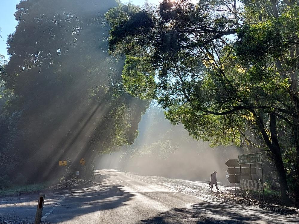 Banner pic: Light fog with glorious sun rays shining through and lighting up trees.